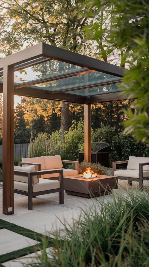 Dengan garis-garis yang bersih, material inovatif, dan desain minimalis, pergola ini memberikan keteduhan dan kenyamanan sekaligus meningkatkan estetika baik di teras atau halaman belakang Anda.